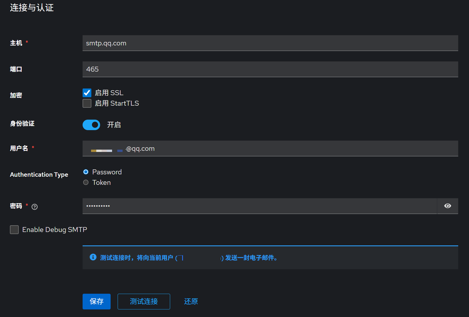 如果想要测试连接,需要提前为当前访问管理后台的用户配置一个邮箱地址
